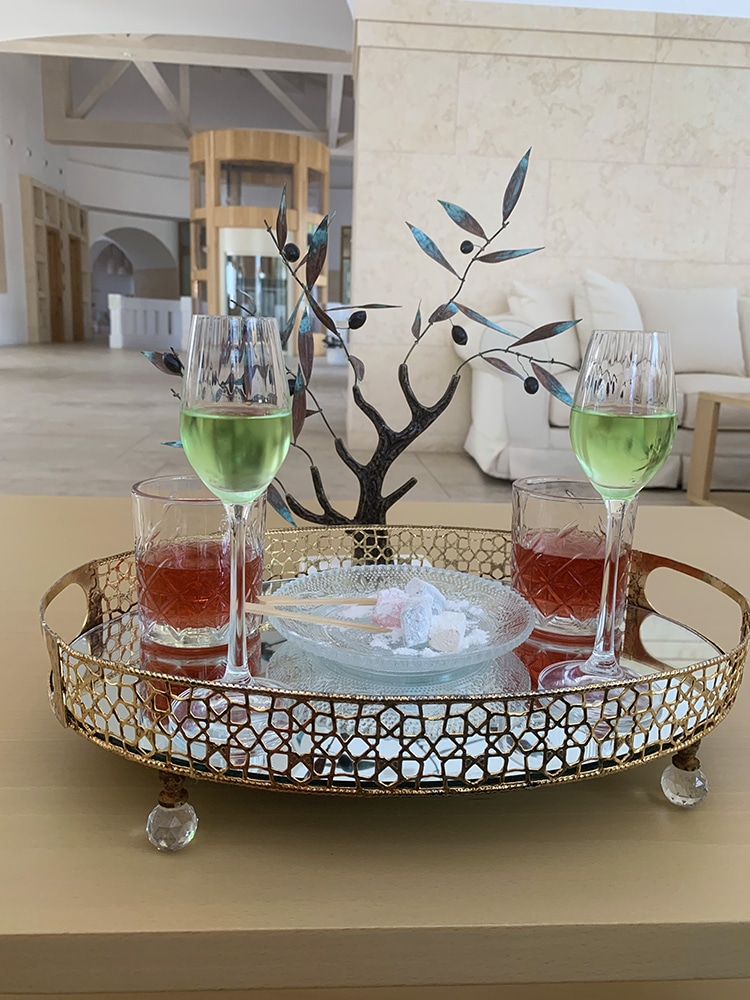 Tervetuliaismaljat hotellin aulassa. Harmillisesti jäi selvittämättä muu, paitsi että vihreä oli omenamehua.